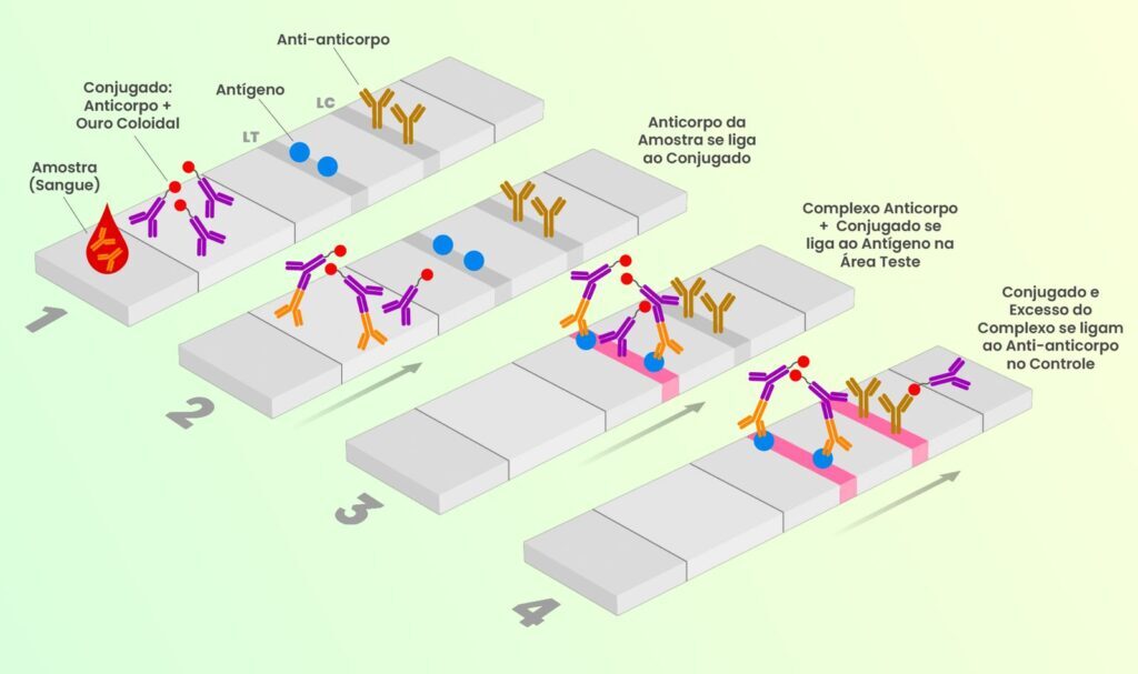 Os testes imunocromatográficos são amplamente utilizados e, apesar do nome complicado, tratam-se basicamente da detecção de analitos na amostra, por meio de uma membrana onde ocorrem forças capilares e ligações específicas entre anticorpos e antígenos, da seguinte maneira: