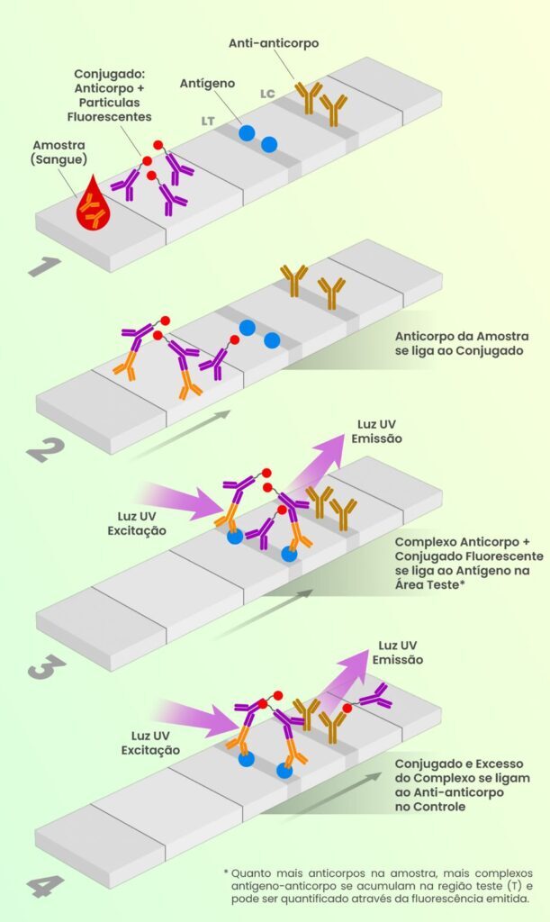 - Quanto mais analito na amostra, mais complexos antígeno-anticorpo se acumulam na região teste (T) e podem ser quantificados através da fluorescência emitida. Em amostras não reagentes, não haverá a formação do complexo fluorescente;